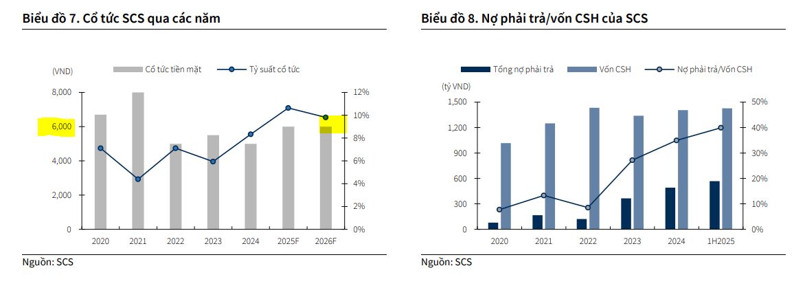 SCS luôn duy trì mức chi trả cổ tức tiền mặt cao. Với tình hình tài chính lành mạnh và không có nợ vay, KBSV dự kiến mức cổ tức năm 2025 và 2026 sẽ ở mức 6,000 VND/cổ phiếu.
