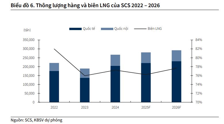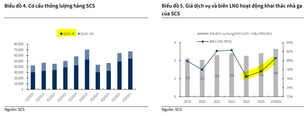 Thông lượng hàng quốc tế là động lực tăng trưởng chính của SCS, được dự báo đạt mức tăng trưởng 7.5% trong năm 2025 nhờ vào việc có thêm khách hàng mới và nhà ga T3 Tân Sơn Nhất đi vào hoạt động, giúp giải tỏa tắc nghẽn .Sau đó chậm lại còn 4.5% yoy trong 2026.