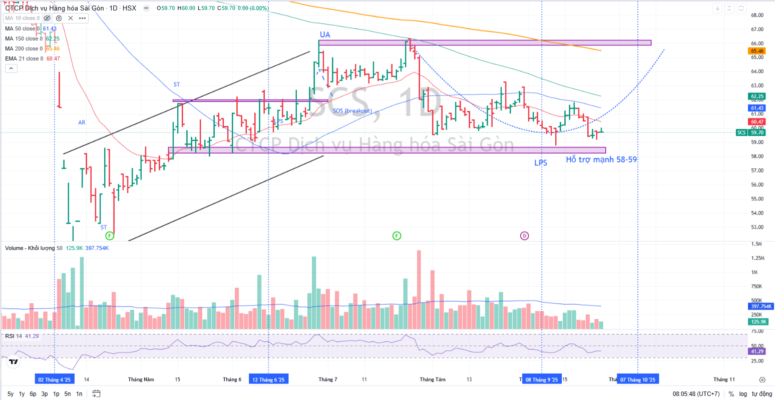 Tuy nhiên, vùng giá 58-59,000 đang đóng vai trò hỗ trợ mạnh cho SCS. Khả năng cao cổ phiếu tạo đáy quanh vùng hỗ trợ này.