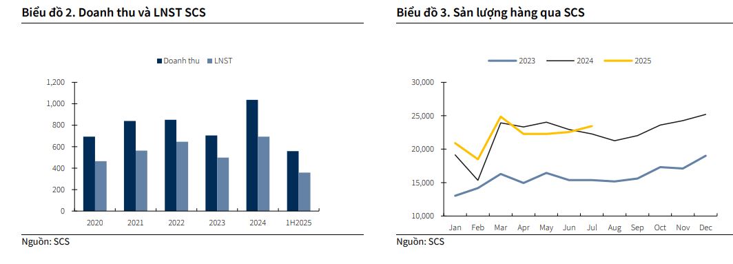 Trong 6 tháng đầu năm 2025, SCS ghi nhận doanh thu đạt 558 tỷ VND (+17% so với cùng kỳ), hoàn thành 48% kế hoạch cả năm. Lợi nhuận sau thuế chỉ đạt 359 tỷ VND (+7% so với cùng kỳ), tăng trưởng chậm hơn đáng kể so với doanh thu do SCS đã hết thời gian ưu đãi thuế và chịu mức thuế 20% từ năm 2025.