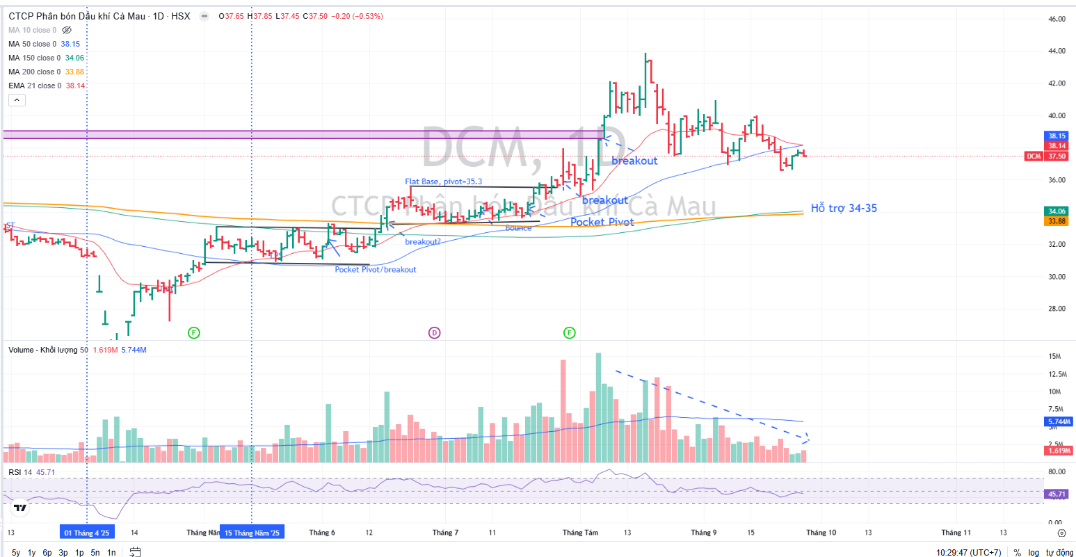Trên đồ thị, RS của DCM là 67, hoạt động ở mức trung bình trong thời gian qua. Cổ phiếu DCM đã nằm dưới MA50 ngày cho thấy đang xây lại nền giá. Điểm hỗ trợ mạnh ở vùng giá 34-35,000 đồng.