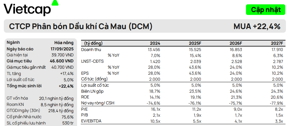 Vietcap (17.9.2025) điều chỉnh tăng 14.5% giá mục tiêu của DCM lên mức 46,600 đồng/cổ phiếu và duy trì khuyến nghị MUA.