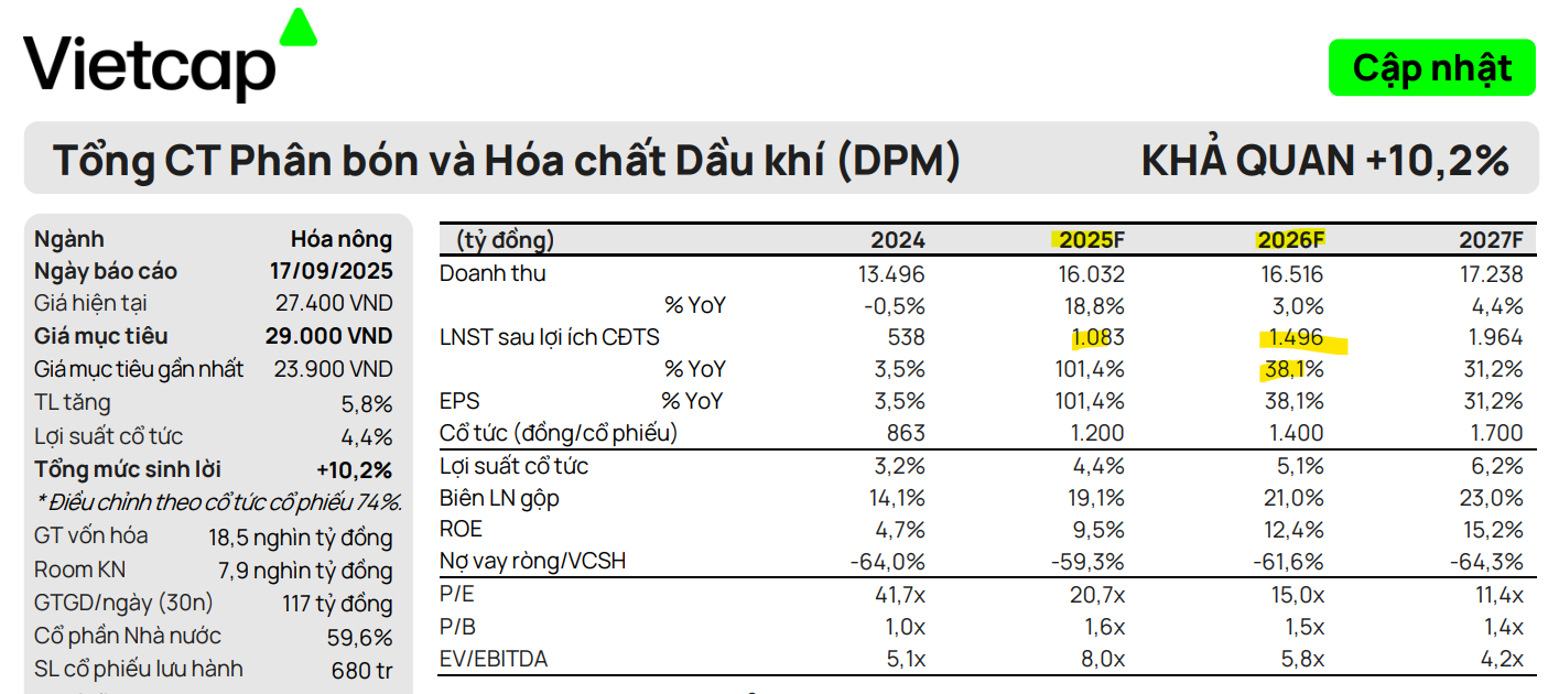 Tương tự, Vietcap (17.9.2025) điều chỉnh tăng 21.3% giá mục tiêu của DPM lên mức 29,000 đồng/cổ phiếu và duy trì khuyến nghị KHẢ QUAN.