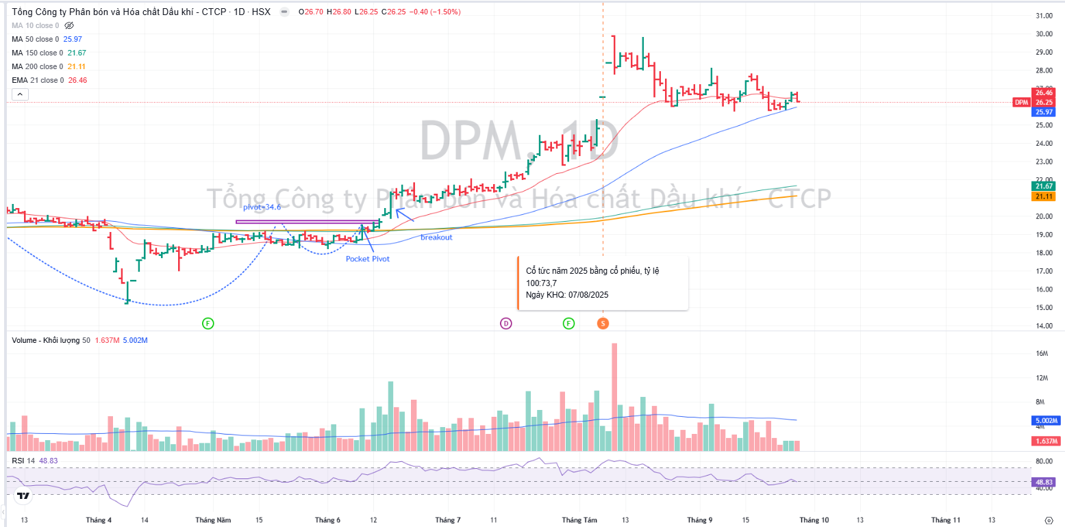 Trên đồ thị, RS của DPM là 83 nằm trong số các cổ phiếu hoạt động tốt trên thị trường, nhờ câu chuyện trả cổ tức bằng cổ phiếu tỷ lệ lớn 73% để tăng vốn điều lệ. Sự kiện này đánh dấu giai đoạn cổ phiếu DPM tăng giá cao trào kể từ breakout nền giá vào tháng 6.