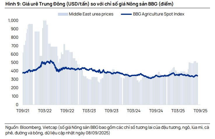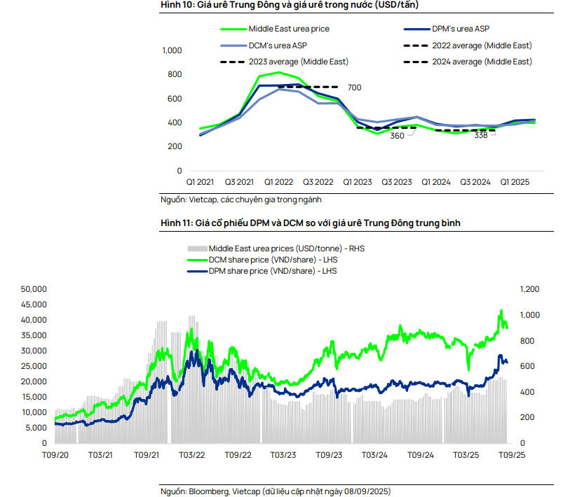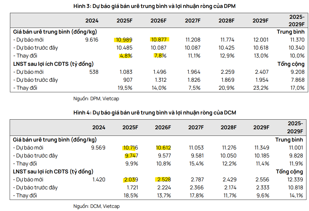 Hỗ trợ doanh nghiệp nội địa: Vietcap điều chỉnh tăng lần lượt 12% và 10% giả định giá bán urê trung bình giai đoạn 2025-2029 của DCM và DPM, phản ánh mức giá quốc tế tăng đột biến và giá bán thực tế cao hơn ước tính trong 9 tháng đầu năm.