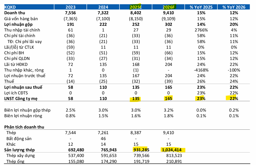 1. Hoạt động cốt lõi hồi phục: Doanh thu tăng 7% nhờ sản lượng tiêu thụ thép tăng 10% so với cùng kỳ. Trong đó, thép xây dựng tăng 11% và thép ống tăng 6%, phản ánh sự phục hồi theo xu hướng chung của ngành vật liệu xây dựng và thị trường bất động sản.