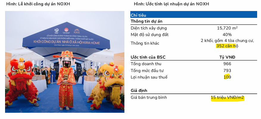 BSC kỳ vọng thời điểm mở bán sớm nhất sẽ vào Quý 2/2026 và bàn giao vào nửa cuối năm 2027. Phần NOXH chỉ chiếm khoảng 13% tổng giá trị dự án giai đoạn 1, ước tính 147 tỷ VNĐ. Phần lớn giá trị dự án sẽ đến từ Shophouse và Biệt thự, tuy nhiên thời điểm triển khai chính thức của phần thấp tầng này vẫn chưa được công ty công bố. BSC sẽ tiếp tục theo dõi tiến độ pháp lý và kế hoạch vay vốn để cập nhật chi tiết.