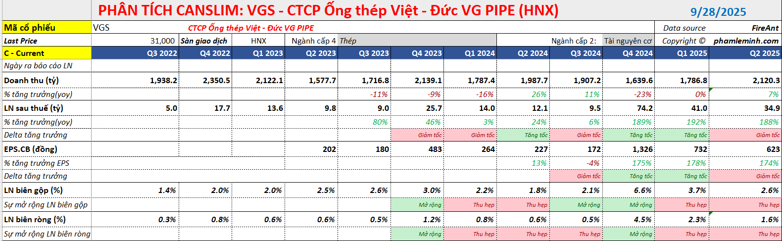 Kết thúc quý 2/2025, VGS ghi nhận Doanh thu thuần đạt 2,120 tỷ VNĐ (+7% so với cùng kỳ năm trước, +19% so với quý trước) và Lợi nhuận sau thuế của cổ đông công ty mẹ (LNST-CĐTS) đạt 35 tỷ VNĐ (tăng mạnh +188% so với cùng kỳ).