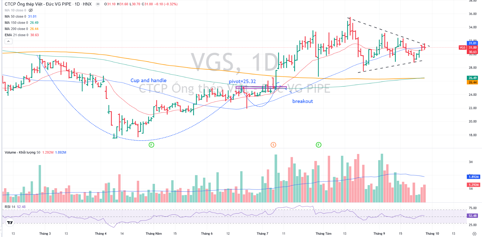 Trên đồ thị, RS của VGS là 78, hoạt động ở mức khá tốt, khi dòng tiền đang chú ý đến cổ phiếu midcap. Vốn hóa hiện nay của VGS là 1,900 tỷ.