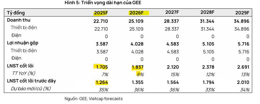 Thiết bị Điện: Thị phần của Cadivi tại miền Bắc mới chỉ đạt khoảng 18%, còn nhiều dư địa tăng trưởng so với mức 80% tại miền Nam. Động lực chính đến từ việc EVN đẩy mạnh đầu tư lưới điện theo Quy hoạch điện VIII sau hai năm trì hoãn. GEE đã điều chỉnh tăng kế hoạch LNST năm 2025 lên 2,819 tỷ VND (bao gồm lợi nhuận thoái vốn), tương đương LNST cốt lõi ước đạt 1,903 tỷ VND (tăng 28% so với cùng kỳ).
