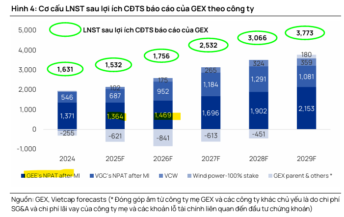 Mặc dù dự phóng LNST báo cáo năm 2025 đạt 1,500 tỷ VND (giảm 6% so với cùng kỳ do khoản lãi thoái vốn thấp hơn), lợi nhuận cốt lõi được dự phóng tăng 47% so với cùng kỳ. Vietcap dự phóng tốc độ tăng trưởng kép (CAGR) LNST sau lợi ích CĐTS báo cáo giai đoạn 2025-2029 là 25% nhờ sự tăng trưởng ổn định của GEE (12%), VGC (12%) và sự bứt phá của VCW (37%) cùng với đóng góp từ Fairmont.