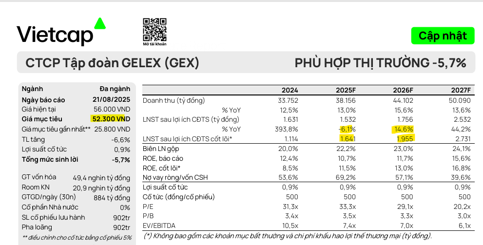Vietcap đã đưa ra sự điều chỉnh đáng kể cho cổ phiếu GEX, quyết định nâng Giá mục tiêu thêm 104% so với báo cáo trước, lên 52,300 đồng/cổ phiếu. Mức tăng định giá này phản ánh triển vọng lợi nhuận cốt lõi mạnh mẽ của các công ty thành viên. Tuy nhiên, do giá cổ phiếu đã tăng quá nhanh trong vòng 4 tháng qua (251%), Vietcap đã hạ khuyến nghị từ Khả quan xuống Phù hợp thị trường.