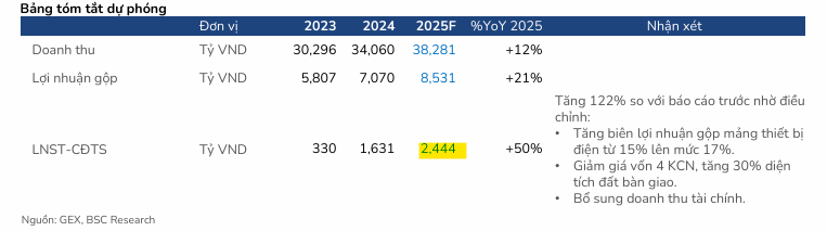 Trong khi đó, BSC nhận định triển vọng kinh doanh năm 2025 của GEX rất tích cực và dự phóng doanh thu đạt 38,281 tỷ VND (tăng 12% so với cùng kỳ) và LNST-CĐTS đạt 2,444 tỷ VND (tăng 50% so với cùng kỳ), tăng 122% so với dự phóng trước đó.