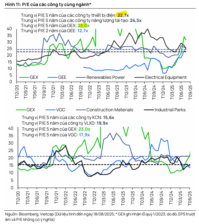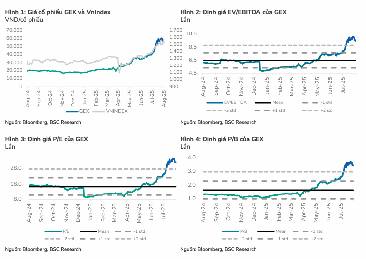 Mặc dù Vietcap (21.8.2025) quyết định nâng giá mục tiêu thêm 104% so với báo cáo trước, lên 52,300 đồng/cổ phiếu, nhưng GEX đang giao dịch ở mức P/E dự phóng 2025/2026 lần lượt là 33.3 lần và 29.1 lần, cao hơn mức P/E trung vị 5 năm là 23.0 lần. Điều này khiến Vietcap phải hạ khuyến nghị xuống Phù hợp thị trường, cho thấy định giá hiện tại đã phản ánh phần lớn các tin tức tích cực về hoạt động kinh doanh.