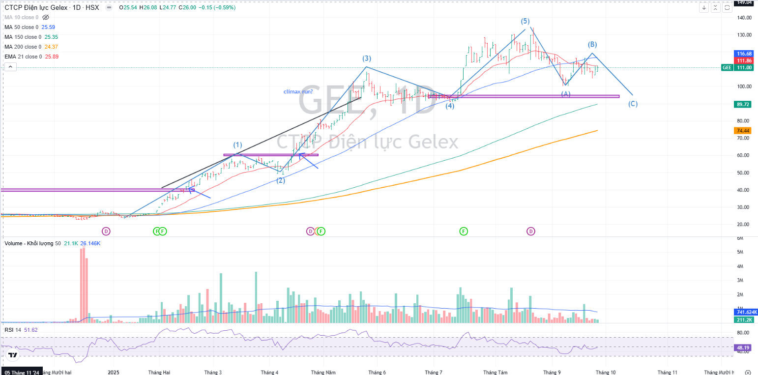 Cả GEX và GEE đều đánh mất MA50 ngày cho thấy tín hiệu bán. Khả năng hai cổ phiếu này đều có thêm một nhịp giảm nữa theo sóng (C). Lưu ý hỗ trợ bởi đường MA150 ngày cho từng cổ phiếu.