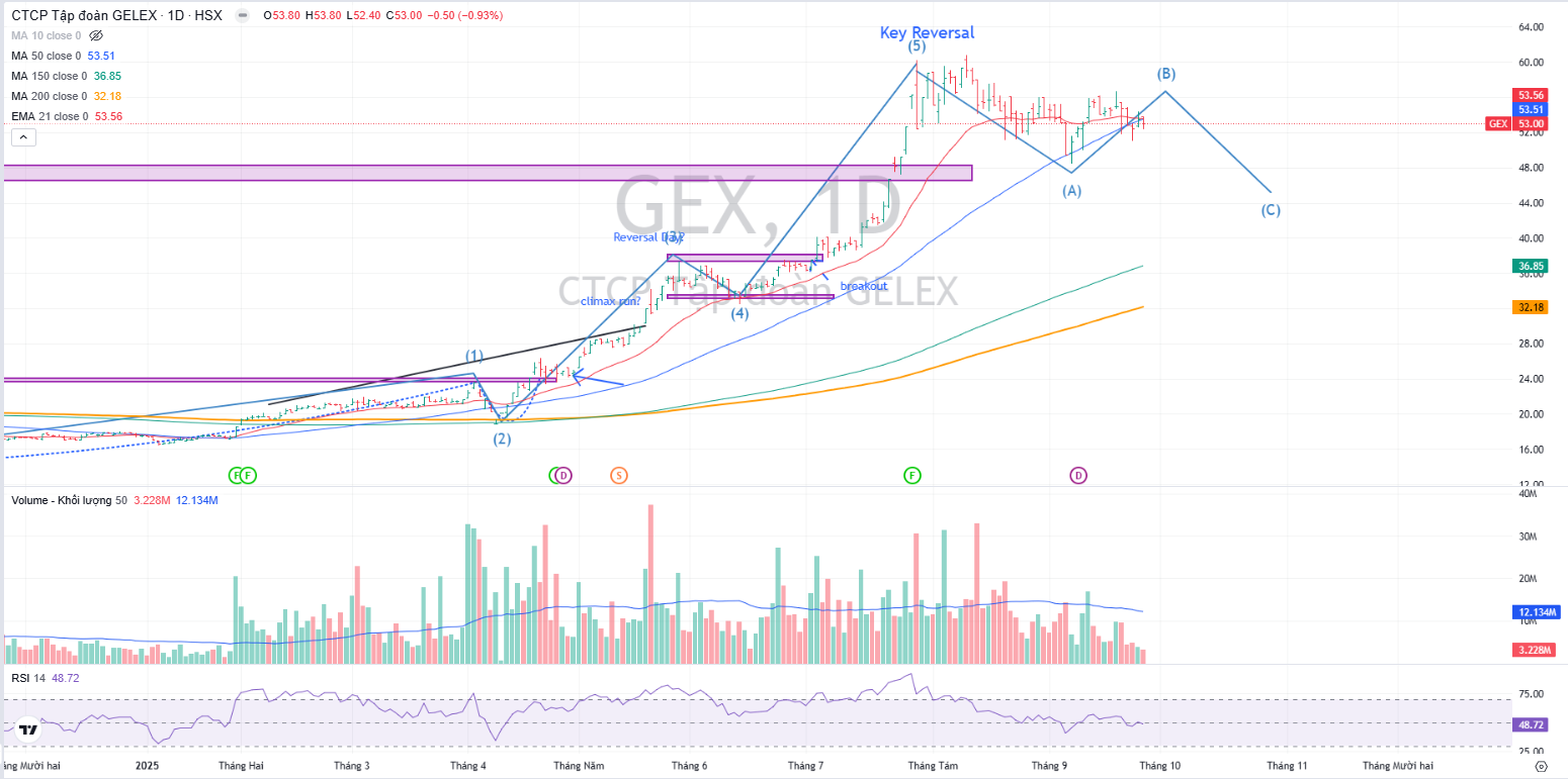 Trên đồ thị, RS của GEX và GEE lần lượt ở mức 95 và 91, hoạt động tốt vượt trội trên thị trường. Đây là hai leader đã breakout nền giá vào đầu sóng, hồi tháng 4.2025, và dẫn dắt cả thị trường đi lên.