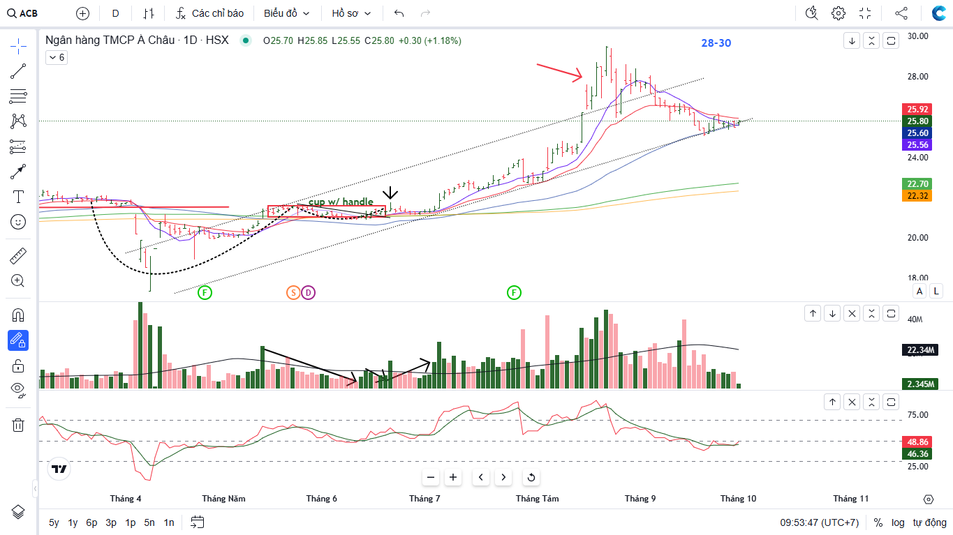 Trên biểu đồ kỹ thuật, ACB có RS=77.2 (cải thiện từ 74, mức hoạt động tốt trên thị trường). ACB đã sớm tìm hỗ trợ ở MA50 ngày, và đang siết quanh với thanh khoản thấp dần. Khả năng đây có thể là vùng hỗ trợ cứng của ACB trước khi bật tăng trở lại. Lưu ý, ACB có mức tăng tương đối khiêm tốn so với các bank cùng quy mô trong đợt tăng giá gần 700 điểm của thị trường, vậy nên dư địa upside vẫn còn, và có thể trở thành chủ lực kéo điểm cho thị trường thế cho các bank đã tăng quá mạnh.