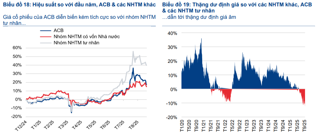 ACB đang giao dịch ở mức P/B forward 1.2 lần, thấp hơn so với bình quân nhóm NHTM tư nhân (1.38 lần), trong khi ROE cao hơn đáng kể (20% so với 17.8%).