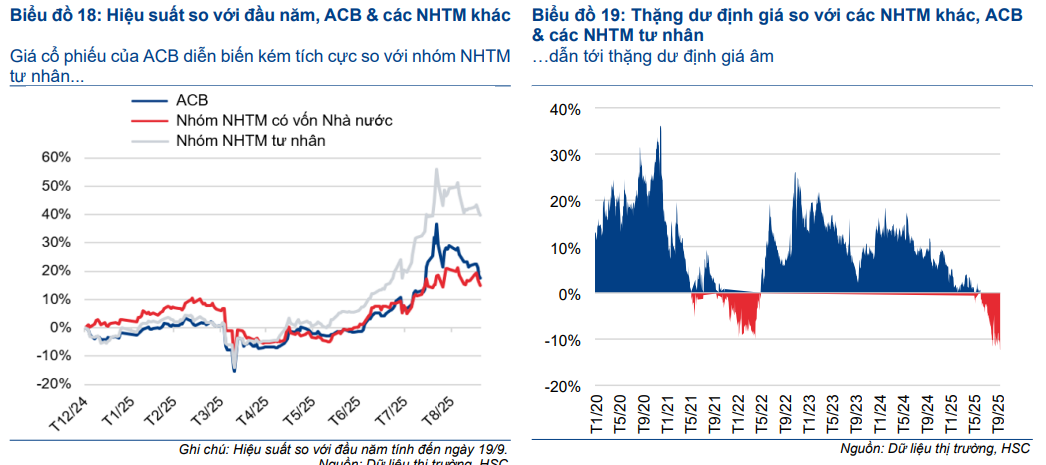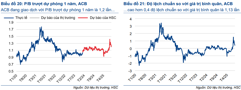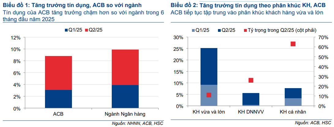 Theo đó, HSC dự báo LNTT nửa cuối năm 2025 đạt 11.7 nghìn tỷ đồng (+11.1% YoY), được hỗ trợ bởi: (1) Tín dụng tăng trưởng 17% so với cùng kỳ, tập trung vào khách hàng doanh nghiệp và doanh nghiệp vừa và lớn; (2) NIM cải thiện dần 10 điểm cơ bản mỗi quý khi ACB tận dụng tỷ lệ cho vay cao hơn trên tài sản chất lượng; và (3) Thu nhập dịch vụ, sau khi chạm đáy Q2 do hạch toán phí thẻ, kỳ vọng phục hồi về mức bình quân.