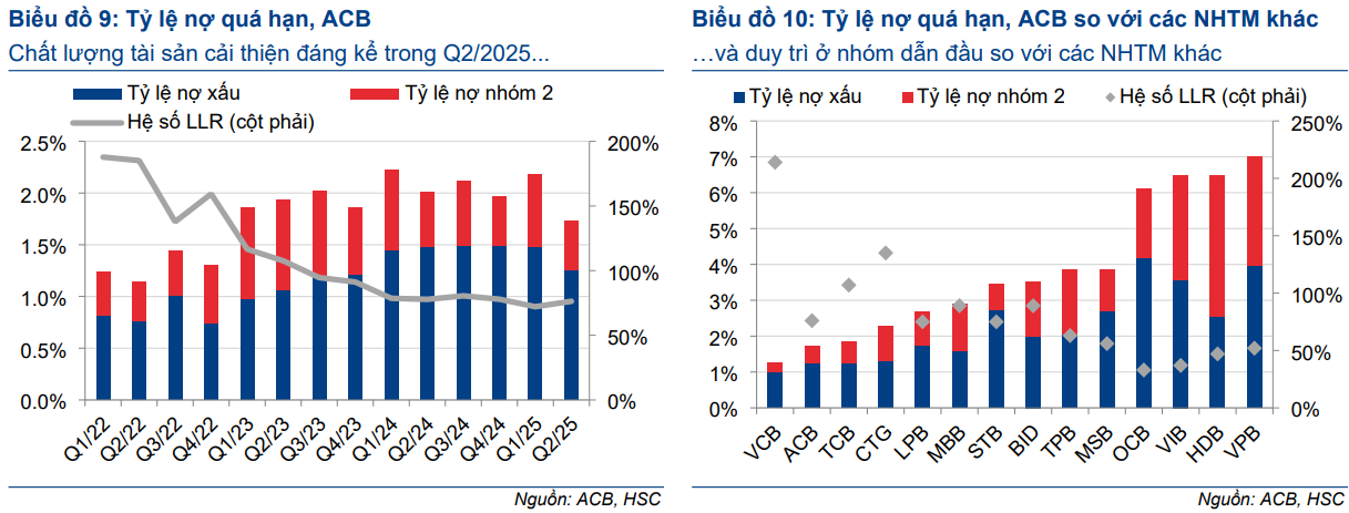 Tính đến cuối quý 2/2025, ACB duy trì tỷ lệ nợ xấu ở mức 1.26%, giảm từ 1.48% quý 1 nhờ triển khai nhiều biện pháp tái cấu trúc danh mục cho vay tập trung vào phân khúc doanh nghiệp vừa và lớn, đồng thời tăng cường thu hồi nợ theo quy định của Nghị quyết 42. Dư nợ nhóm 2 giai đoạn “chờ xử lý” giảm từ 2,979 tỷ đồng (Q4/2023) xuống còn 1,362 tỷ đồng nhờ thanh lý tài sản bảo đảm và hoàn nhập dự phòng, qua đó hệ số bao phủ nợ xấu (LLR) dự báo tăng về 78.4% năm 2025.