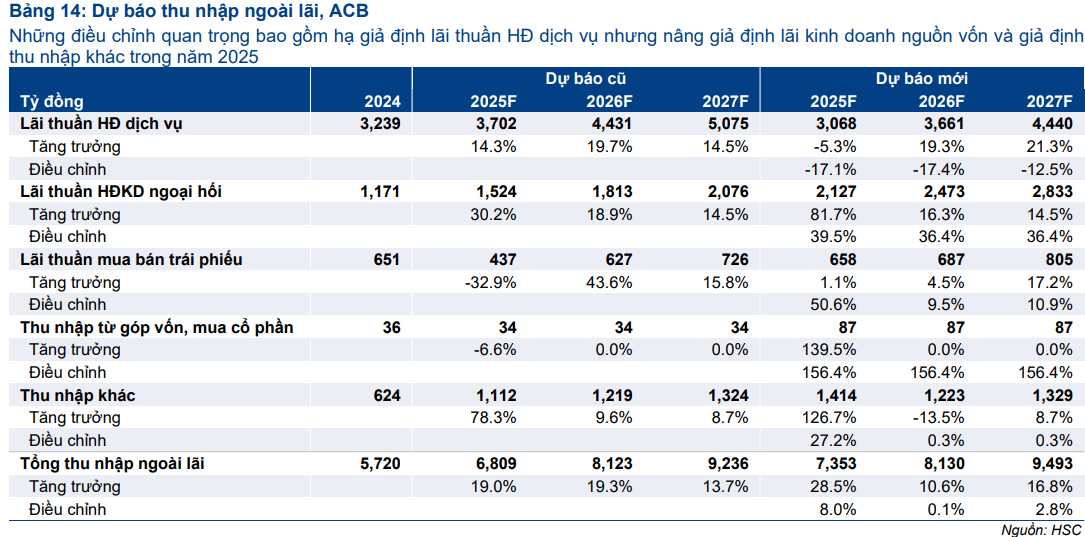 HSC dự báo thu nhập dịch vụ sẽ phục hồi trở lại mức bình quân từ quý 4/2025 khi các hợp đồng bancassurance và phí thẻ mới có hiệu lực, giúp thu nhập ngoài lãi cả năm 2025 tăng 32% YoY.