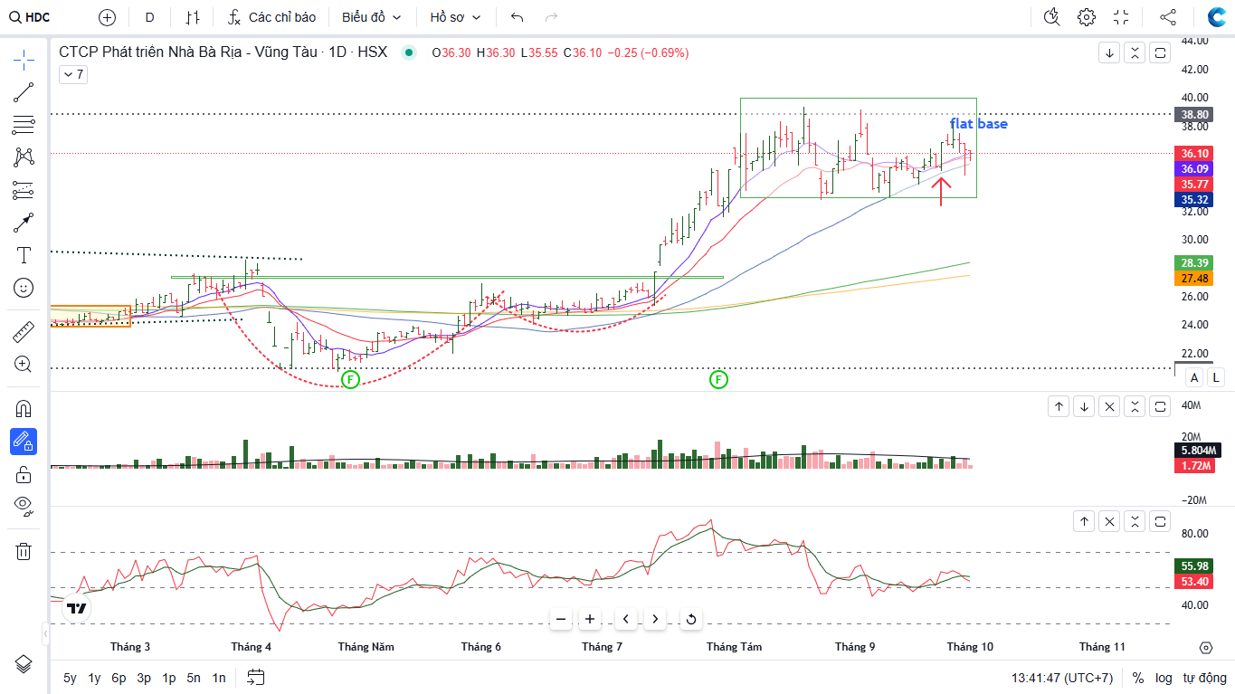 Trên biểu đồ kỹ thuật, HDC có RS=93 (cải thiện từ 89), mức hoạt động tốt trên thị trường. Ngày 24/9/2025, HDC cũng có pocket pivot ngay tại MA50 ngày (đây có thể xem là vùng hỗ trợ của HDC), xây dựng nền giá phẳng. Quan sát hành động giá của HDC quanh 35,500 đồng-37,000 đồng. Nếu test thành công, khả năng cao HDC sẽ có thể vượt đỉnh T8/2022.