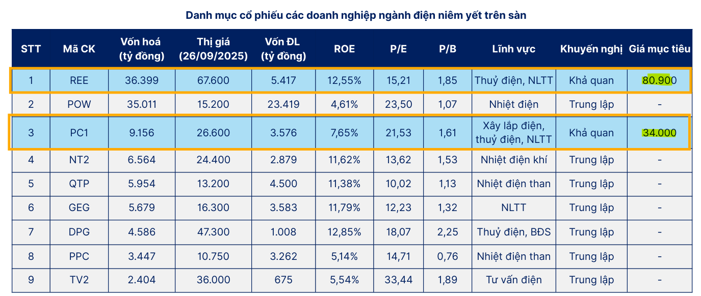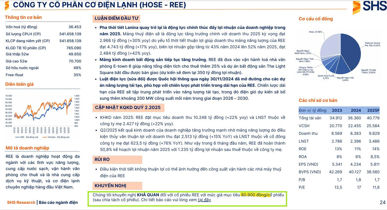 SHS ưa thích REE và PC1 cho mục tiêu dài hạn nhờ sức khoẻ tài chính lành mạnh và có nhiều lợi thế trong việc mở rộng các dự án năng lượng tái tạo trong tương lai. Theo đó, SHS (29.9.2025) đưa ra giá mục tiêu 80,900 đồng đối với REE và 30,900 đồng với PC1