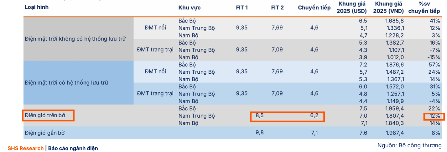 Sau thời gian dài tháo gỡ liên quan đến giá đối với các dự án NLTT, Bộ công thương đã ban hành quyết định 988/QĐ-BCT ngày 10/04/2025 (đối với điện mặt trời) và quyết định 1824/QĐ-BCT ngày 26/06/2025 (đối với điện gió ngoài khơi) phê duyệt khung giá phát điện cho các loại hình NLTT. Đối với điện gió, khung giá mới được đánh giá là đủ hấp dẫn với mức giá điện gió trên bờ cao hơn 14 – 22% so với khung giá chuyển tiếp và điện gió gần bờ cao hơn 8%.