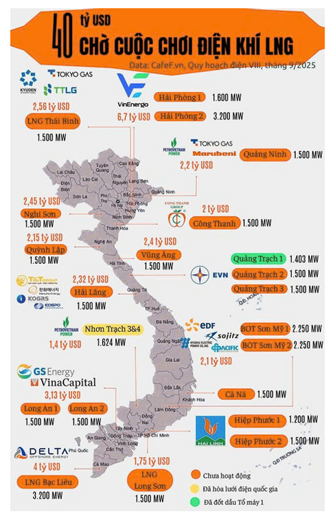 Tổng công suất điện khí LNG quy hoạch đạt hơn 36,500 MW, gần bằng một nửa tổng công suất hệ thống điện hiện tại, với tổng vốn đầu tư dự kiến vượt 40 tỷ USD.