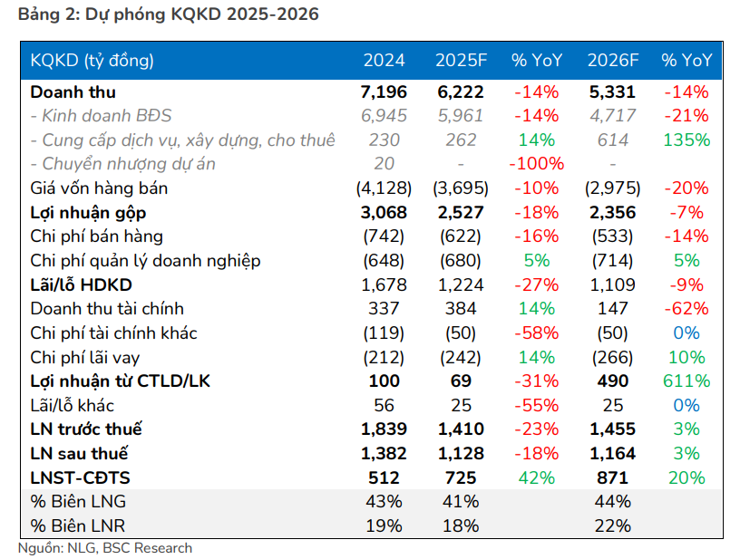 Nhìn về năm , tăng trưởng lợi nhuận được dẫn dắt mạnh mẽ bởi thu nhập từ Công ty Liên Doanh Liên Kết (LDL). BSC kỳ vọng NLG sẽ bắt đầu bàn giao tại Izumi và Paragon Đại Phước. Theo đó, LNTT được dự phóng lần lượt đạt (tăng so với cùng kỳ) và (tăng so với cùng kỳ) trong năm . Các dự phóng này đều đến từ hoạt động kinh doanh cốt lõi.