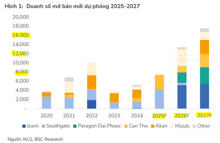 KBSV dự báo doanh số bán hàng của NLG sẽ tiếp tục tăng trưởng mạnh mẽ, đạt 7,680 tỷ VND (+48% so với cùng kỳ) trong năm 2025 và 9,218 tỷ VND (+20% so với cùng kỳ) trong năm 2026. Dự báo này dựa trên kỳ vọng về các dự án trọng điểm như Southgate, Izumi City, Cần Thơ, Mizuki Park và đặc biệt là Akari City (giai đoạn 3). Trong đó, doanh số bán hàng Izumi City 2025 ước đạt 2,189 tỷ VND và doanh số bán hàng Cần Thơ ước đạt 1,820 tỷ VND.