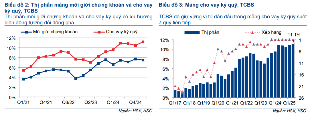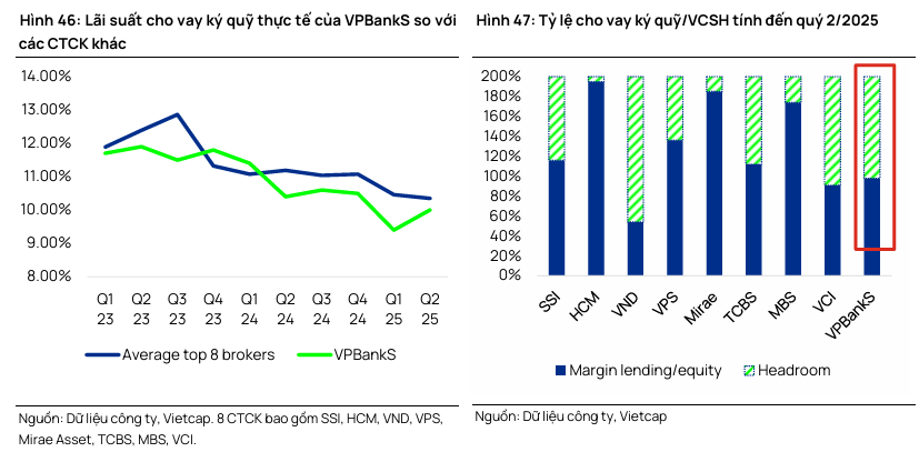 Về các dòng sản phẩm cạnh tranh, VPBankS đã có sự mở rộng mạnh mẽ trong mảng cho vay ký quỹ, với dư nợ đạt khoảng 27-28 nghìn tỷ đồng tính đến cuối quý 3/2025, xếp vị trí thứ ba toàn thị trường. Đà tăng trưởng này đến từ lợi thế chi phí vốn thấp nhờ sự hậu thuẫn của ngân hàng mẹ và SMBC, cùng với mức lãi suất cho vay ký quỹ cạnh tranh.