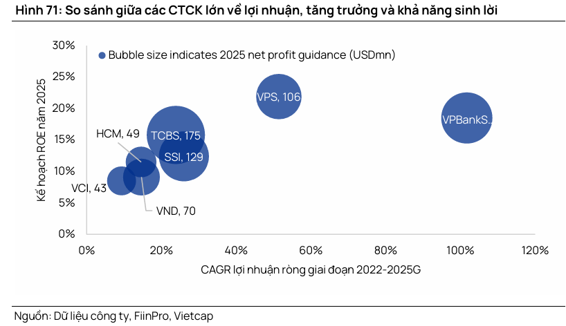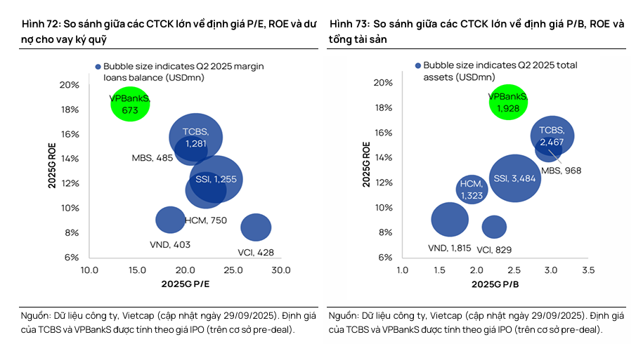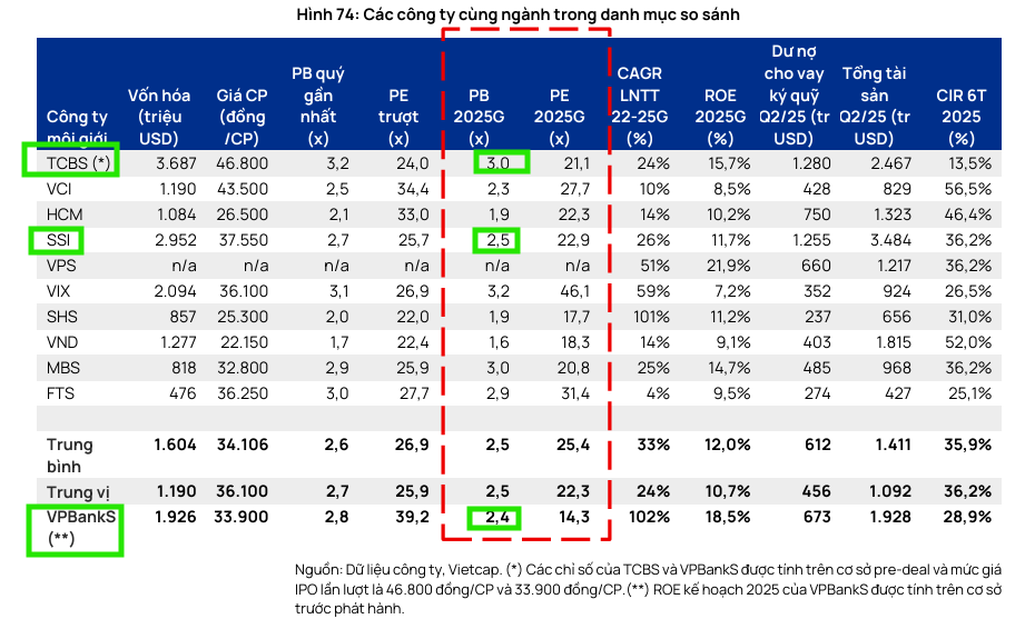 Về định giá, Vietcap cho rằng VPBankS mang lại tiềm năng hấp dẫn, hiện đang giao dịch với mức P/B năm 2025 trước phát hành là 2.4 lần (sau phát hành là 1.9 lần) và P/E năm 2025 trước phát hành là 14.3 lần, thấp hơn so với mức trung vị ngành dự phóng năm 2025 lần lượt là 2.5x và 22.3x. Sự chiết khấu này diễn ra ngay cả khi VPBankS được dự kiến đạt ROE vượt trội 18.5% năm 2025, cho thấy tiềm năng tăng giá mạnh mẽ hơn so với các đối thủ trong ngành.