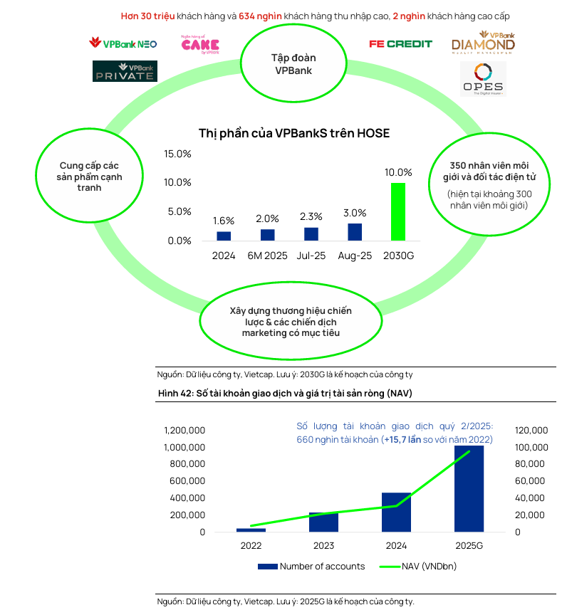 - Mô hình kinh doanh đa kênh và hệ sinh thái VPBank là lợi thế cạnh tranh: VPBankS tận dụng 30 triệu khách hàng từ ngân hàng mẹ, kết hợp môi giới truyền thống và kỹ thuật số, mở rộng kênh phân phối qua ứng dụng E-Partner và Stock Guru AI.