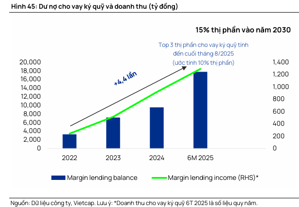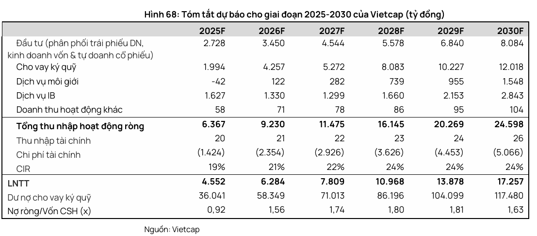 Vietcap dự phóng CAGR doanh thu và lợi nhuận lần lượt đạt 31.8% và 30.5% trong giai đoạn 2025-2030. Cho vay ký quỹ sẽ tiếp tục là động lực tăng trưởng chính, đóng góp 40%–42% tổng doanh thu trong giai đoạn này.