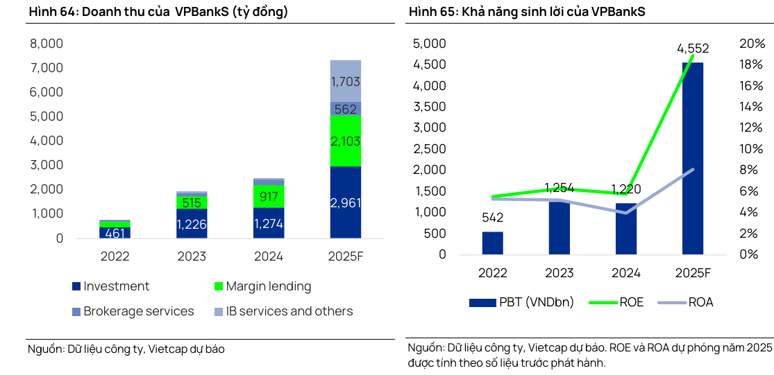 Kỳ vọng tăng trưởng mạnh mẽ giai đoạn 2025–2030: VPBankS đặt mục tiêu LNTT năm 2030 đạt 17,500 tỷ đồng, ROE 19%, tương ứng CAGR lợi nhuận 32%. Dự phóng LNTT năm 2025 là 4,552 tỷ đồng (+273% YoY).