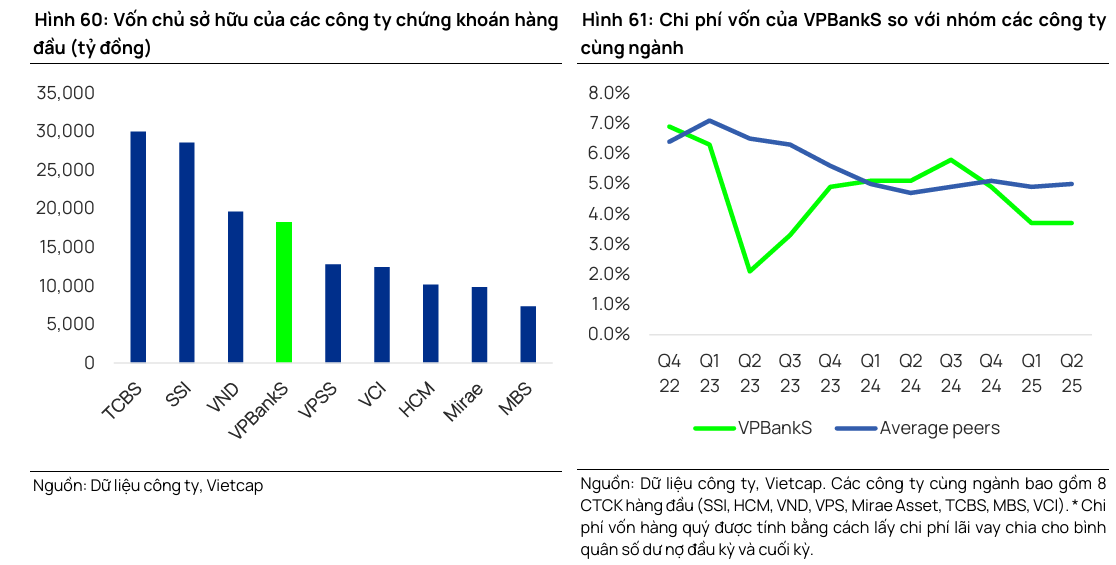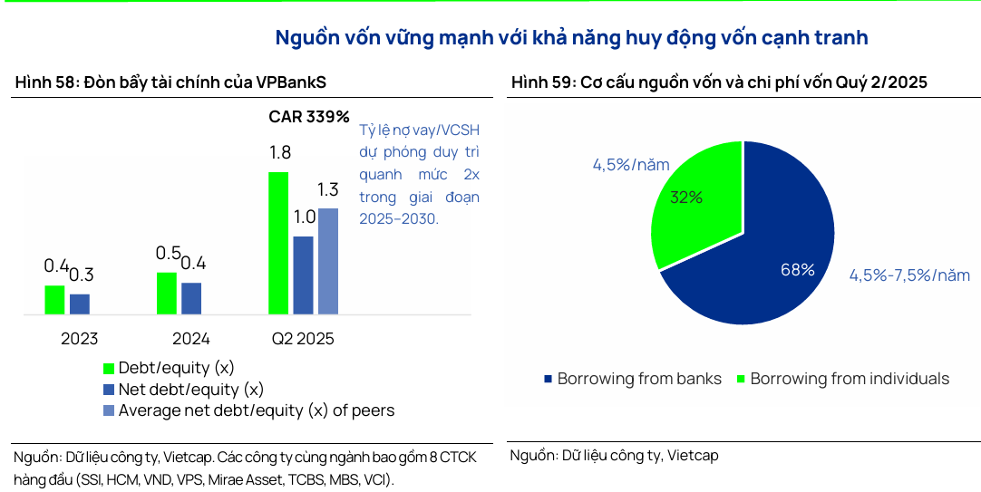 VPBankS đã thành công trong việc đa dạng hóa các nguồn vốn chi phí thấp. Tính đến Quý 2/2025, nợ phải trả của công ty chủ yếu đến từ các khoản vay ngắn hạn từ ngân hàng thương mại và khách hàng cá nhân – trong đó nhóm khách hàng cá nhân được huy động thông qua các sản phẩm thị trường tiền tệ phối hợp cùng ngân hàng mẹ. Ngoài ra, trong 6T 2025, VPBankS đã huy động được 150 triệu USD khoản vay hợp vốn quốc tế, và dự kiến huy động thêm 250 triệu USD trong 6T 2025 còn lại từ liên minh do SMBC dẫn dắt. Đáng chú ý, công ty hiện vẫn chưa khai thác kênh nợ dài hạn hay trái phiếu doanh nghiệp ngắn hạn, qua đó cho thấy dư địa lớn để tiếp cận thêm nguồn vốn trong tương lai. Vietcap cho rằng vị thế huy động vốn vững chắc này sẽ tạo nền tảng quan trọng để hỗ trợ các mục tiêu tăng trưởng tham vọng của VPBankS.