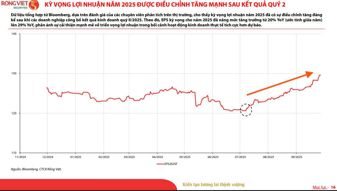 Dữ liệu tổng hợp từ Bloomberg, dựa trên đánh giá của các chuyên viên phân tích trên thị trường, cũng cho thấy kỳ vọng lợi nhuận năm 2025 đã có sự điều chỉnh tăng đáng kể sau khi các doanh nghiệp công bố kết quả kinh doanh quý II/2025. Theo đó, EPS kỳ vọng cho năm 2025 đã nâng mức tăng trưởng từ 20% YoY (ước tính giữa năm) lên 29% YoY, phản ánh sự cải thiện mạnh mẽ về triển vọng lợi nhuận trong bối cảnh hoạt động kinh doanh thực tế tích cực hơn dự báo.
