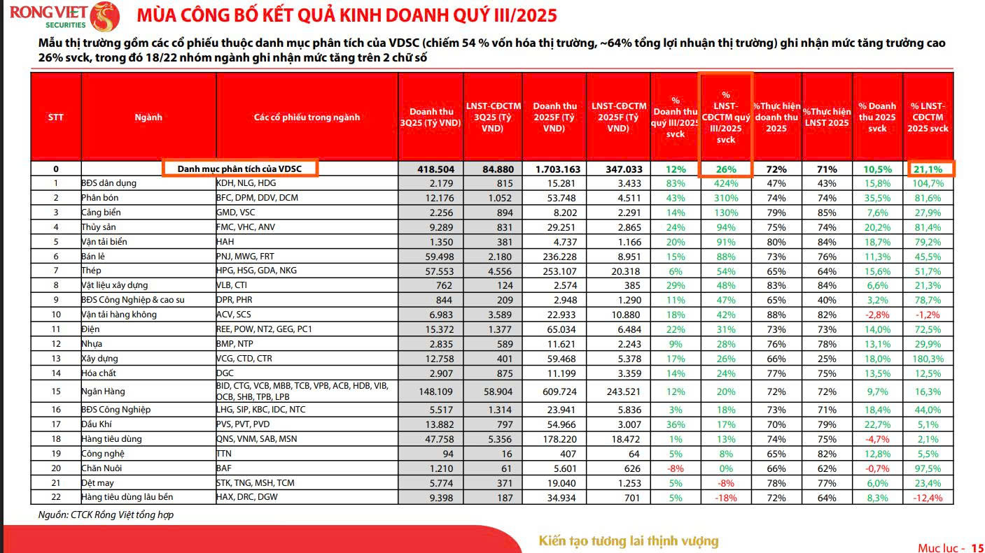 Kết quả kinh doanh quý III/2025 là yếu tố chủ đạo dẫn dắt thị trường, với lợi nhuận dự kiến tăng 22% YoY, cao hơn mức dự phóng top-down 15%; 18/22 nhóm ngành ghi nhận tăng trưởng hai chữ số, phản ánh triển vọng tích cực.