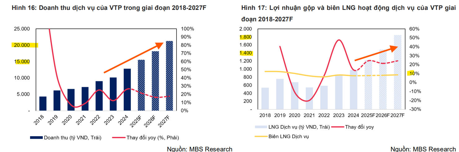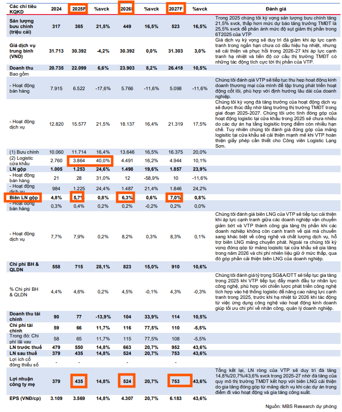 MBS ước tính doanh thu dịch vụ (gồm bưu chính và logistics cửa khẩu) của VTP duy trì đà tăng 21.5%/16.4%/17.5% so với cùng kỳ, qua đó đưa doanh thu thuần tăng lần lượt 6.6%/8.2%/10.5% trong giai đoạn 2025-2027.