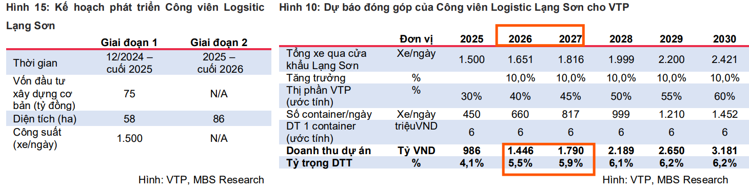 MBS đánh giá dự án Công viên Logistic Lạng Sơn sau khi đóng góp khoảng 4.4% doanh thu thuần của VTP trong 2025, tỷ trọng đóng góp cải thiện lên khoảng 5.5%/5.9% trong 2026/27 và duy trì đóng góp ổn định quanh 6.2% trong tương lai nhờ hoạt động giao thương giữa Việt Nam – Trung Quốc.
