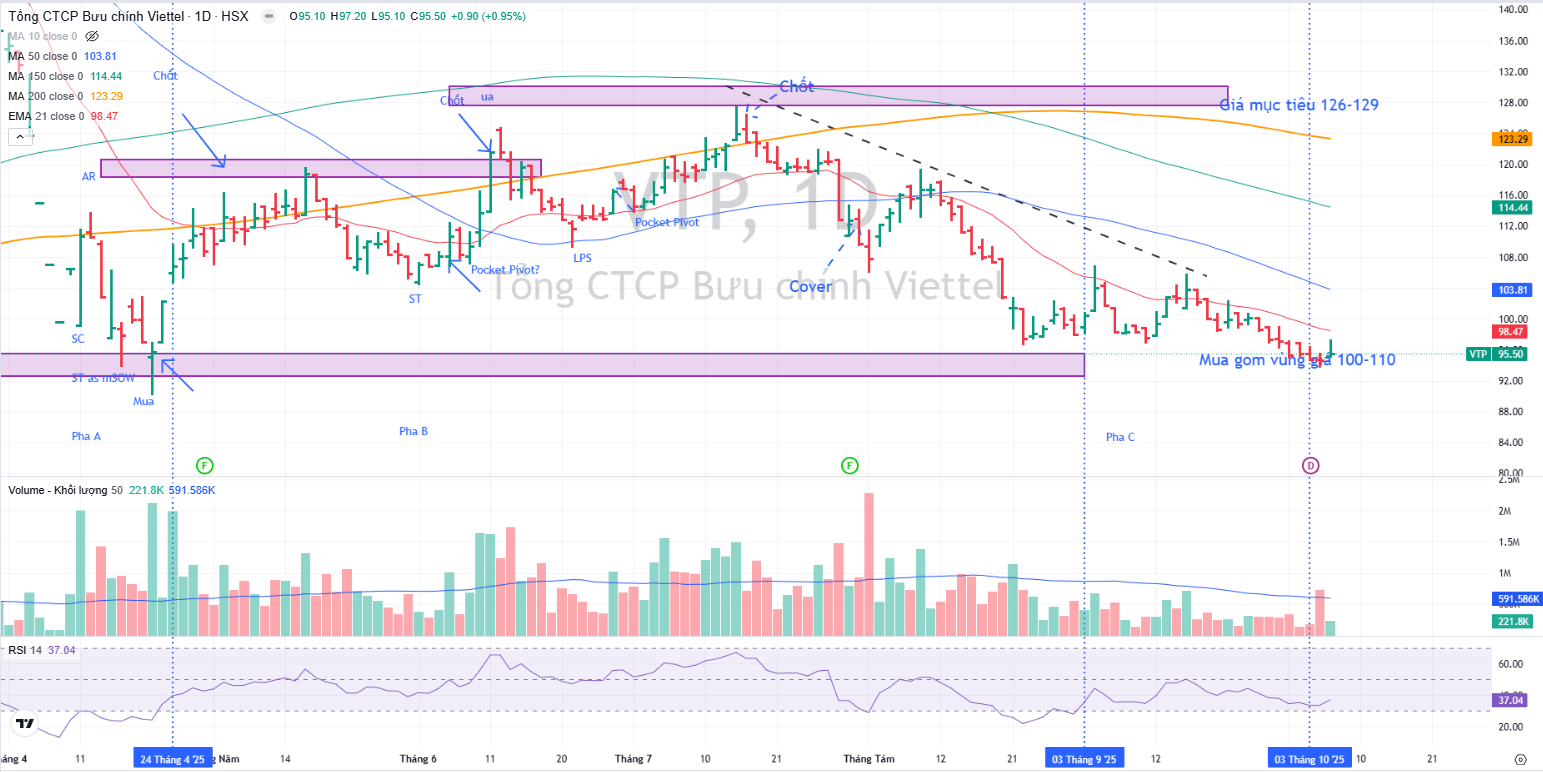 Elibook Team khuyến nghị mua gom VTP ở vùng giá 100,000 đồng. Phân kỳ dương giữa giá và RSI tạo ra khả năng hình thành đáy.