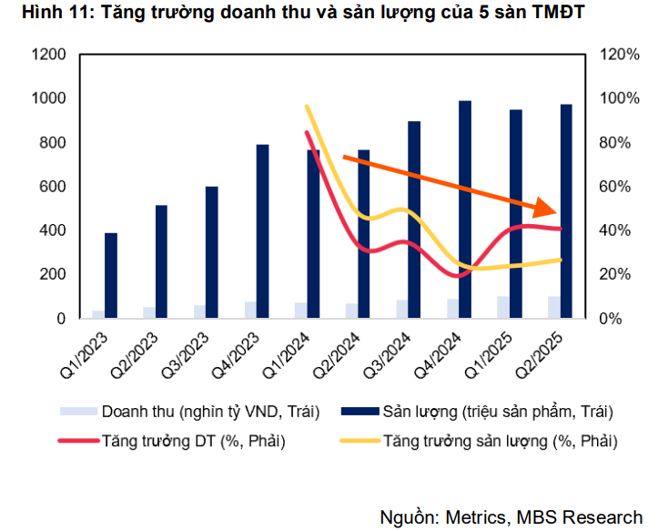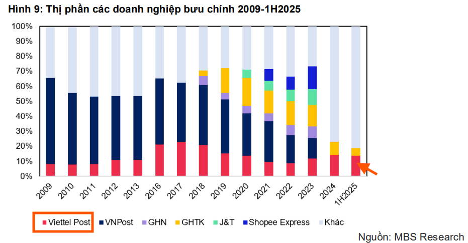 Mặc dù thị trường TMĐT tăng trưởng cao, nhưng VTP phải đối mặt với áp lực cạnh tranh gay gắt từ các đơn vị vận chuyển nội bộ của các sàn TMĐT lớn như Shopee Express và J&T Express. Điều này được phản ánh qua dự báo tăng trưởng sản lượng bưu chính của VTP trong giai đoạn 2025-2027 ở mức thấp hơn tăng trưởng TMĐT: 21.5%/16.5%/16.5% so với cùng kỳ.