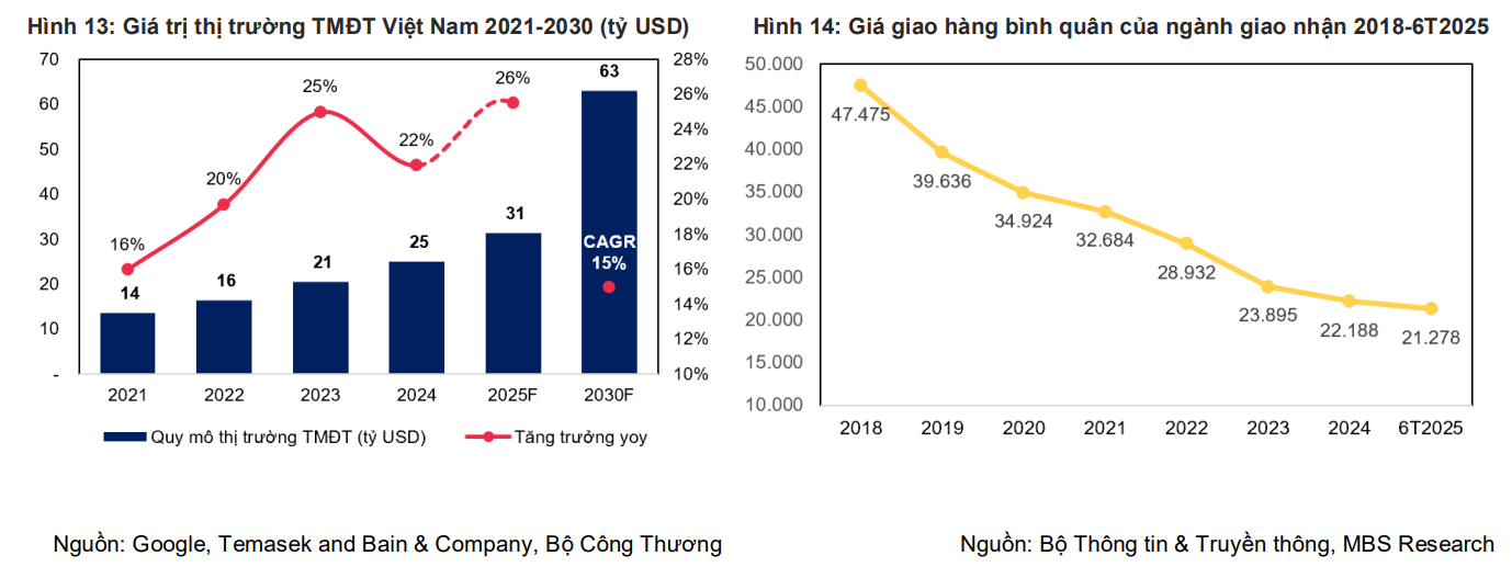 Sự phát triển mạnh mẽ của thị trường thương mại điện tử (TMĐT) là yếu tố chính hỗ trợ đà tăng trưởng của hoạt động bưu chính, chuyển phát của VTP. Nhờ xu hướng mua hàng online gia tăng, quy mô thị trường TMĐT Việt Nam được dự báo sẽ duy trì mức tăng mạnh 25.5% trong năm 2025 và đạt mốc 63 tỷ USD vào năm 2030, tương ứng với mức Tốc độ tăng trưởng kép hàng năm (CAGR) khoảng 15%. Xu hướng này tạo nền tảng vững chắc cho hoạt động bưu chính của VTP.