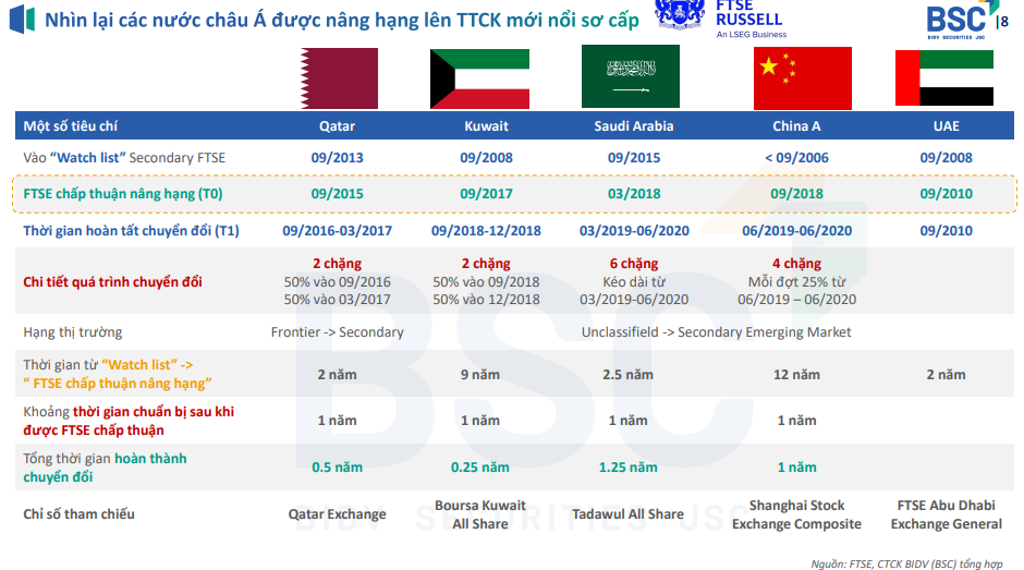 (2) Khoảng thời gian từ khi được đưa vào danh sách theo dõi đến khi được chấp thuận nâng hạng khác nhau đáng kể giữa các quốc gia, và quá trình phân bổ vốn sau khi được chấp thuận thường được chia thành nhiều đợt để tránh biến động mạnh về cung – cầu trên thị trường.