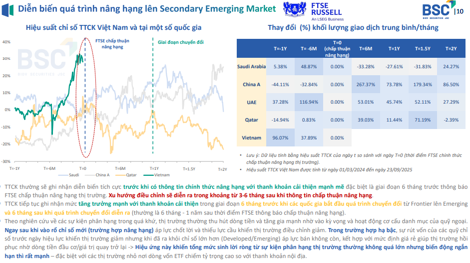 Việc FTSE Russell công bố chấp thuận nâng hạng Việt Nam nhưng đặt hiệu lực chính thức vào tháng 9/2026 không phải là sự trì hoãn, mà là bước đi theo đúng thông lệ quốc tế, phản ánh quy trình chuẩn mà các thị trường như Qatar, Kuwait hay Ả Rập Xê Út từng trải qua. Tất cả các quốc gia châu Á từng được nâng hạng trước đây đều trải qua một giai đoạn “chờ có hiệu lực” tương tự, kéo dài 6–12 tháng để chuẩn bị vận hành, kiểm thử hệ thống và giúp thị trường thích nghi với dòng vốn mới. Đây là giai đoạn cần thiết để kiểm chứng vận hành, hoàn thiện hạ tầng và chuẩn bị thanh khoản, qua đó bảo đảm khi dòng vốn quốc tế thực sự vào, thị trường Việt Nam đã sẵn sàng để hấp thụ bền vững và ổn định.
