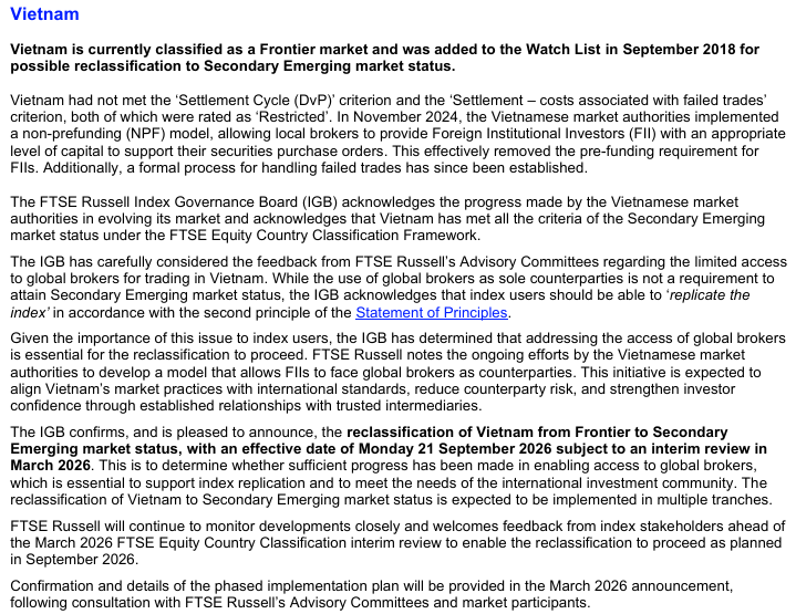FTSE Russell thông báo sẽ nâng hạng Việt Nam từ thị trường cận biên lên thị trường mới nổi thứ cấp, với ngày công bố chính thức là 21 tháng 9 năm 2026, đồng thời kèm theo điều kiện sẽ có một đợt đánh giá tạm thời vào tháng 3 năm 2026 nhằm xác minh mức độ cải thiện trong khả năng tiếp cận của các công ty môi giới quốc tế. Theo FTSE, các cải cách gần đây của cơ quan quản lý Việt Nam — đặc biệt là việc áp dụng cơ chế giao dịch không cần ký quỹ trước, giúp giảm yêu cầu nộp tiền trước khi thực hiện lệnh, cùng với quy trình chính thức xử lý các giao dịch thất bại — được xem là bước tiến quan trọng. Tuy nhiên, FTSE vẫn yêu cầu có bằng chứng thực tế về việc các cơ chế này được triển khai hiệu quả nhằm bảo đảm khả năng mô phỏng chỉ số cho các nhà đầu tư quốc tế.