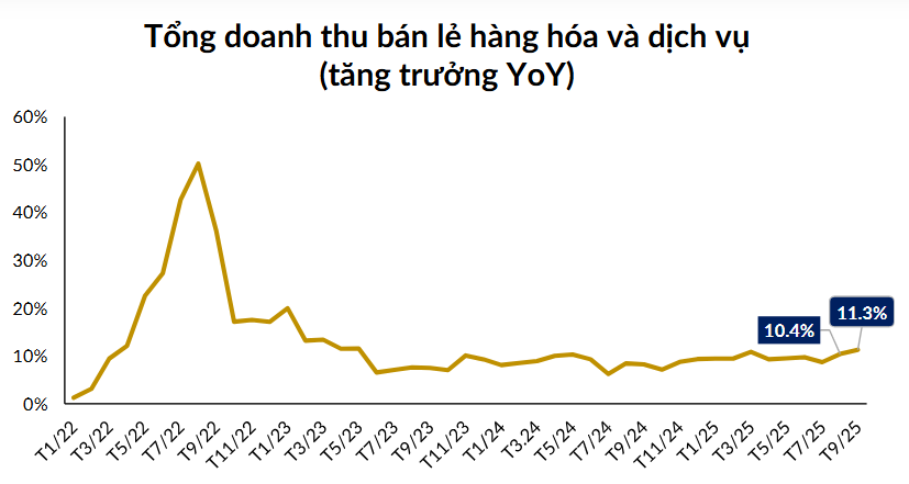 Tám tháng đầu năm 2025, tổng doanh thu bán lẻ hàng hóa và dịch vụ tiêu dùng đạt 4,579 nghìn tỷ đồng, tăng 9.4% so với cùng kỳ năm trước. Riêng tháng 8/2025 đạt 588.2 nghìn tỷ đồng, tăng 10.6%, đánh dấu tháng thứ ba liên tiếp có mức tăng trưởng hai chữ số. Đây là dấu hiệu rõ ràng cho thấy niềm tin tiêu dùng đã hồi phục.