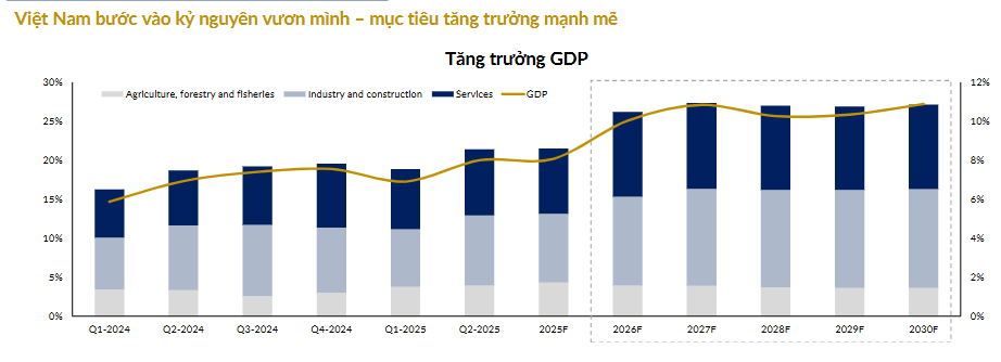 Tăng trưởng GDP Việt Nam năm 2025 dự kiến đạt 8.3%, phản ánh sự phục hồi mạnh mẽ của cả ba khu vực: nông nghiệp, công nghiệp – xây dựng, và dịch vụ. Đây là bước chuyển cho giai đoạn được CKG gọi là “kỷ nguyên vươn mình” – khi nền kinh tế hướng tới tăng trưởng hai chữ số trong giai đoạn 2026–2030.