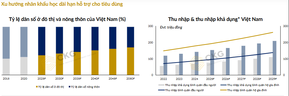 Sự dịch chuyển này hình thành tầng lớp trung lưu và người tiêu dùng thu nhập cao tập trung ở đô thị, kéo theo nhu cầu hàng hóa và dịch vụ chất lượng cao hơn. Thu nhập khả dụng bình quân hộ gia đình giai đoạn 2025–2029 dự kiến tăng 8.1%/năm, còn thu nhập bình quân đầu người tăng 9.68%/năm. Khi thu nhập và khả năng chi tiêu cải thiện, người tiêu dùng chuyển dần từ chi tiêu cho hàng thiết yếu sang các mặt hàng có giá trị cao hơn như sản phẩm chăm sóc cá nhân, hàng tiêu dùng nhanh cao cấp, đồ gia dụng, công nghệ.